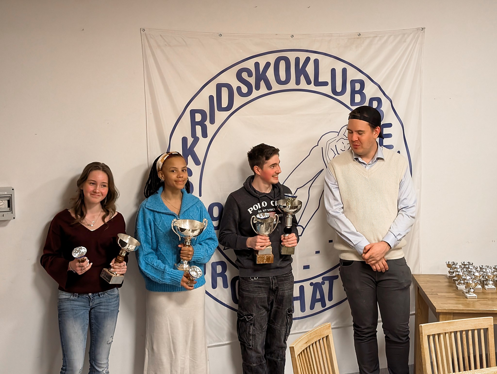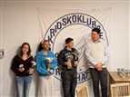 Det var ett 50-tal medlemmar som närvarade och bjöds på tårta, intern lotteri med många priser samt att aktiva erhöll säsongspokaler för 2024/2025. Sista isveckan kördes vårt KM och nu skulle vi även dela ut KM-medaljerna. Samtidigt som allt detta pågick, så rullade bilder från säsongen på en storbildsskärm i lokalen. På bilden här intill har vår ordförande Christer Lorentzon just delat ut Vandringspriserna, A-priset till Beyoncé Andersson, B-priset och Tränings-priset till Loke Forsell och C-priset till Hilla Rosén.